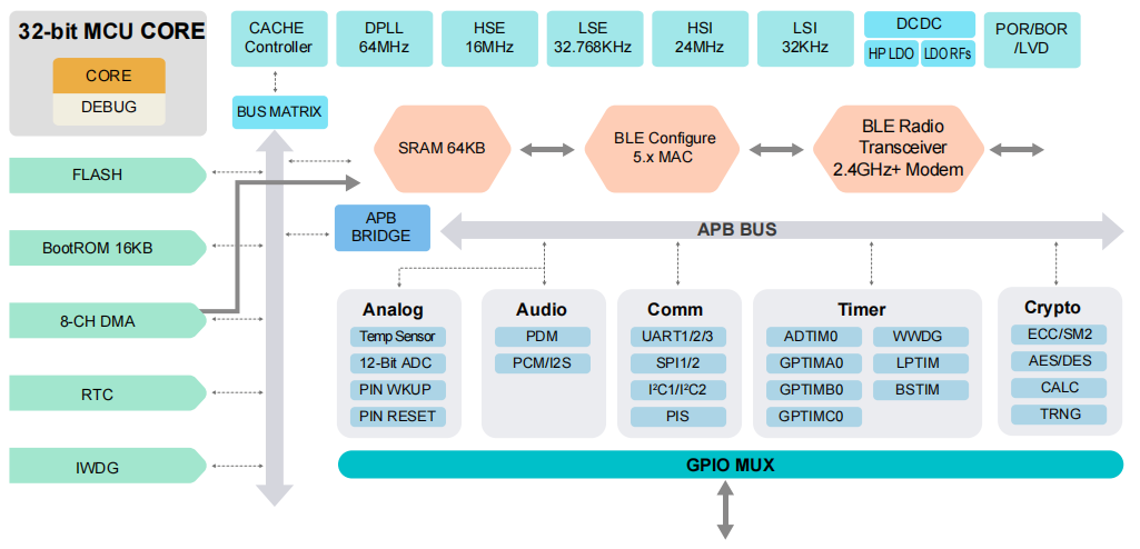 - Contains a 32-bit MCU core, clock frequency is adjustable, up to 64MHz;