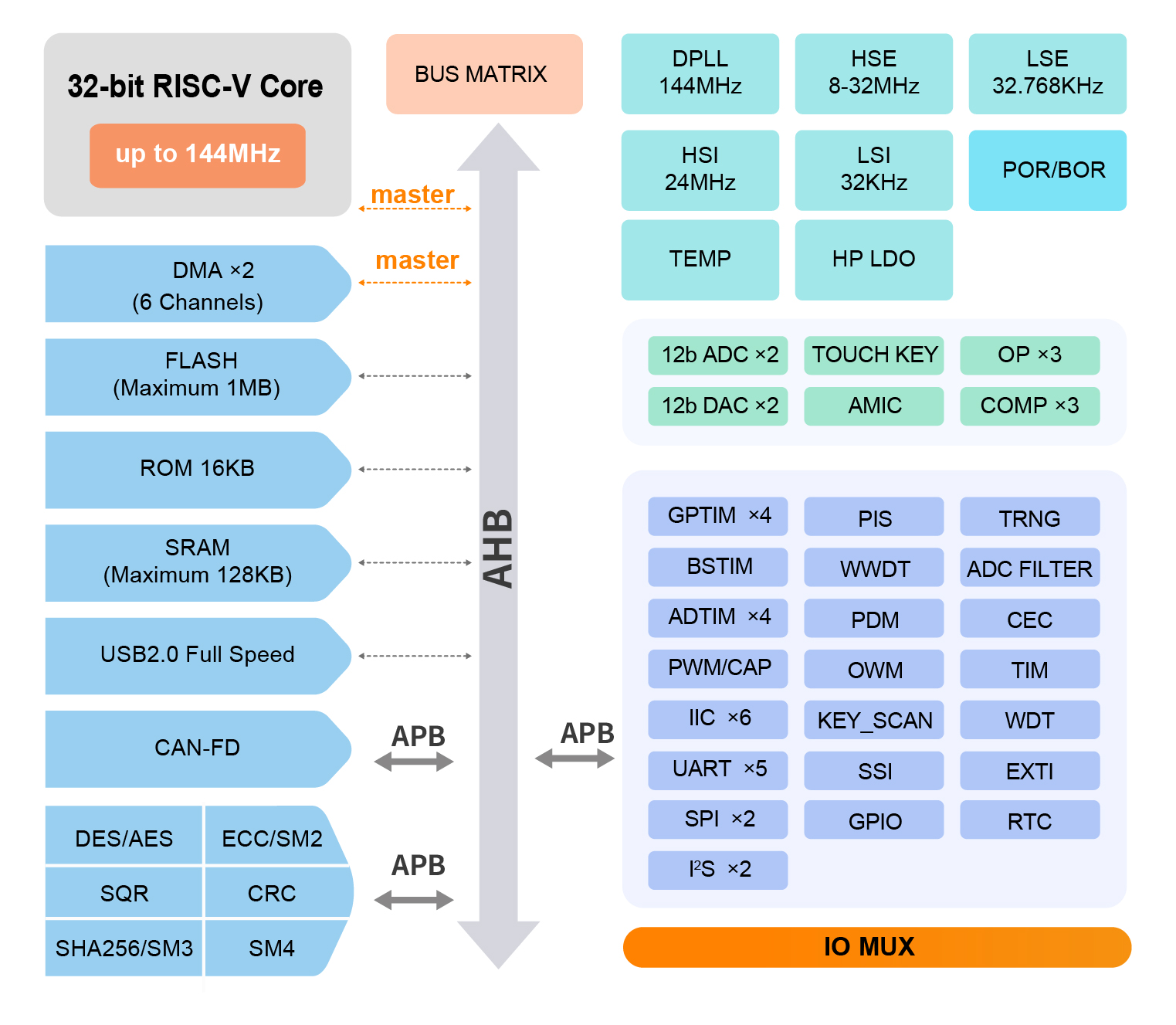 | Part ID | Freq(MHz) | SRAM(KB) | Flash(KB) | GPIO | USB | Timer | UART | SPI | I²C | CAN | ADC | DAC | OP | COMP | TK | KBC | Temp | Package |